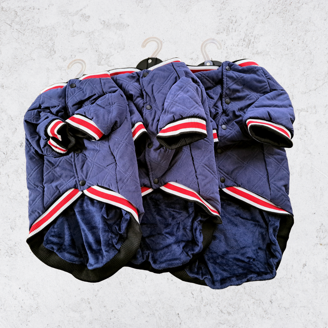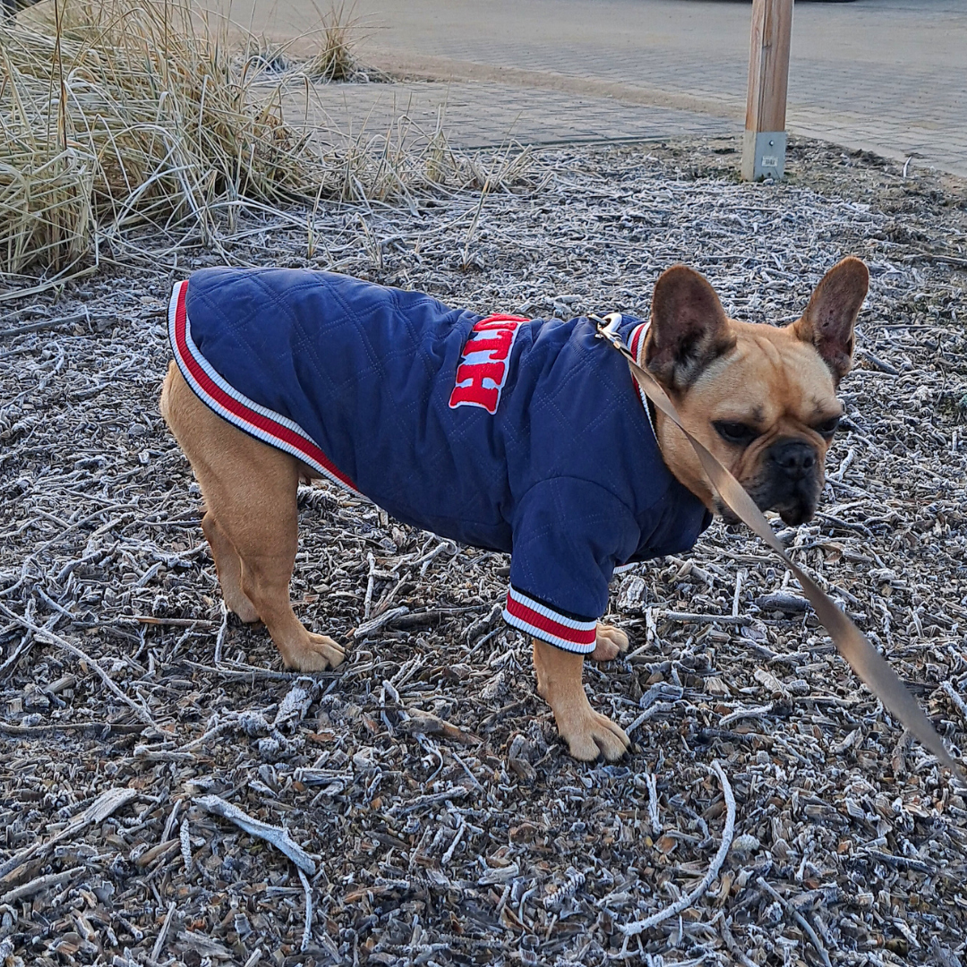 Granatowa kurtka dla psa Barry King zapewni mu komfort termiczny w chłodniejsze dni. Z biało-czerwonymi ściągaczami prezentuje się elegancko, a pikowanie i napis na grzebiecie dodaje jej niepowtarzalnego charakteru. Fasonem przypomina młodzieżową bomberkę w wydaniu deluxe. Prezentuje się bardzo elegancko i jest połączeniem stylu z wysoką funkcjonalnością. To elegancka kurteczka, która ochroni przed zimnem i wilgocią psy, zwłaszcza z krótkim podszerstkiem, które lubią ciepło. Dodatkowo, posiada rękawki wykończone miękkimi ściągaczami, które dodatkowo chronią psie łapki. Dlaczego ta kurtka dla psa jest tak wyjątkowa?